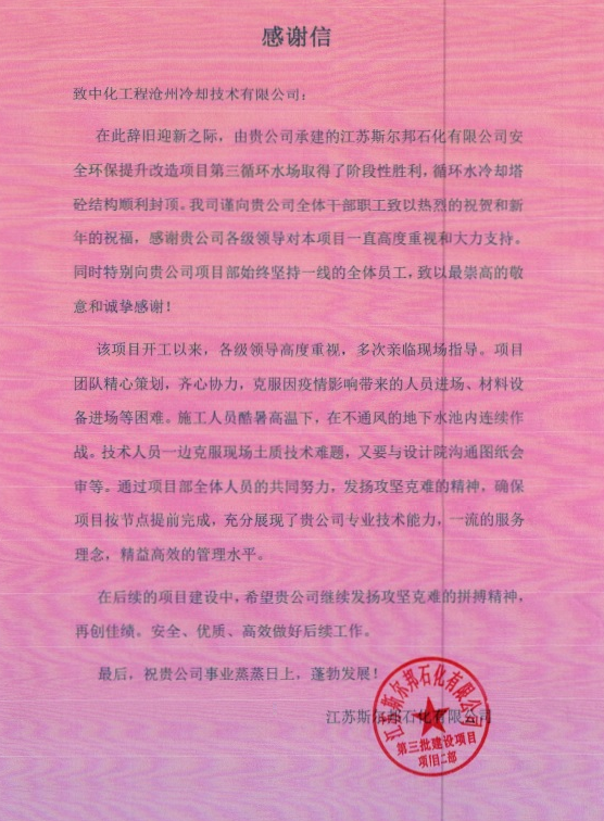 近日,公司收到江苏斯尔邦石化有限公司发来的感谢信,信中对公司斯尔邦项目全体施工人员的敬业精神和专业服务给了予充分肯定和高度赞扬。