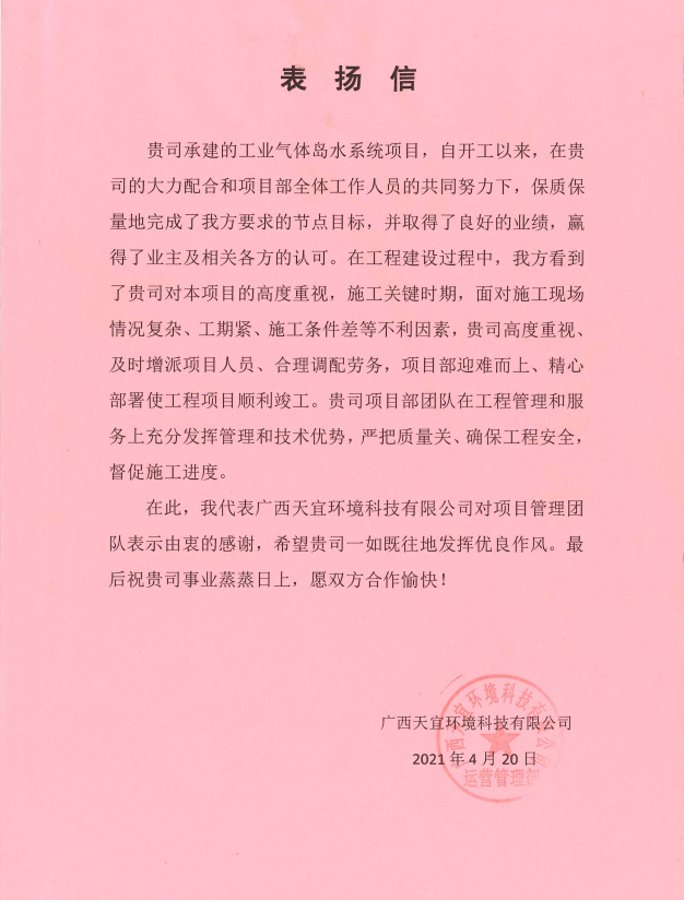 最终,项目施工按原计划节点交付,得到了业主公司的高度赞扬,并收到对方发来的表扬信,在今后的施工中,公司将继续坚持“高质量高标准”的服务与产品,为打造企业品牌,树立企业形象而努力奋斗。