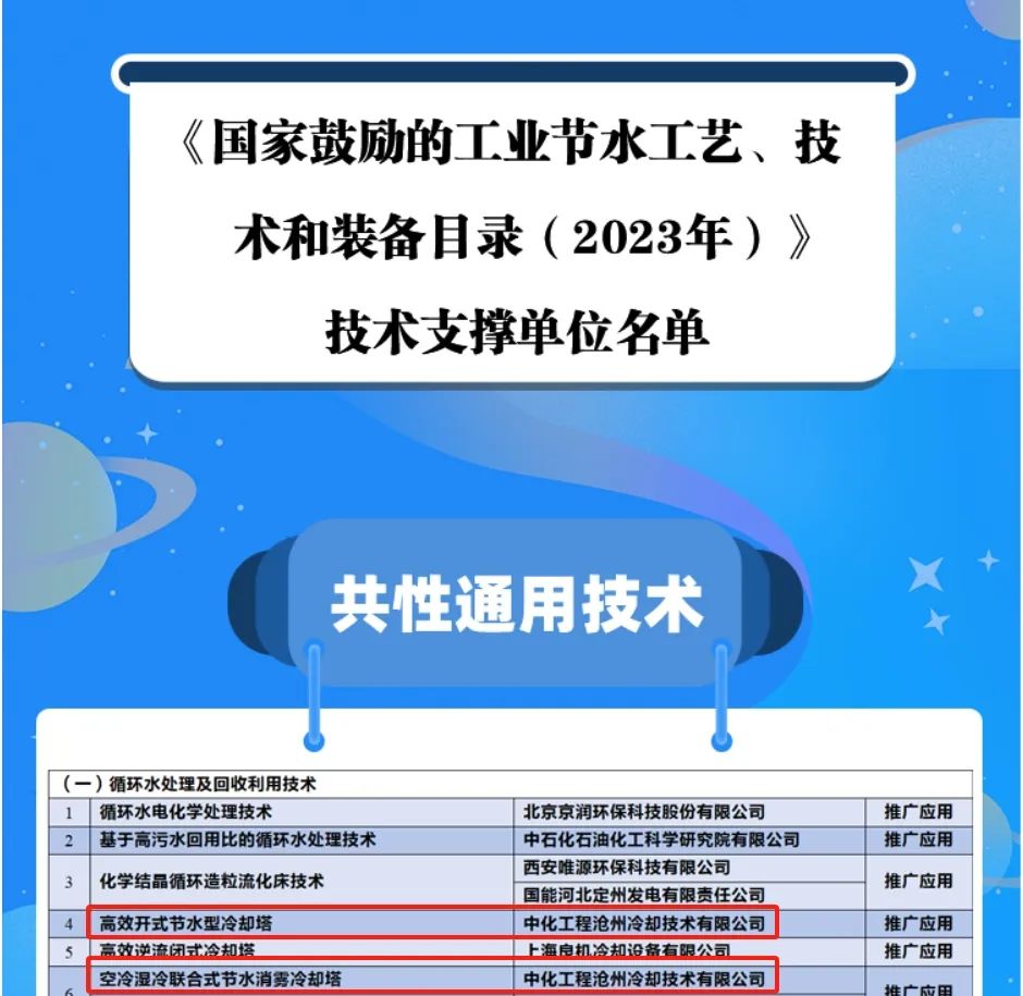 近日,中化学装备集团有限公司所属中化工程沧州冷却技术有限公司《空冷湿冷联合式节水消雾冷却塔》和《高效开式节水型冷却塔》产品成功入选《国家鼓励的工业节水工艺、技术和装备目录(2023)》。此次入选目录,是对沧冷公司在节水节能环保装备领域持续开展应用创新的充分肯定,标志着沧冷公司在工业节水领域的技术实力得到了国家高度认可。
