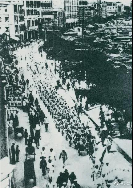 从1925年6月19日起,香港和广州租界的20万工人举行罢工,声援上海人民的反帝斗争。23日,广州和由香港回广州的工人10万余人举行大游行,在沙基惨遭英、法帝国主义的镇压。图为当时的游行队伍。